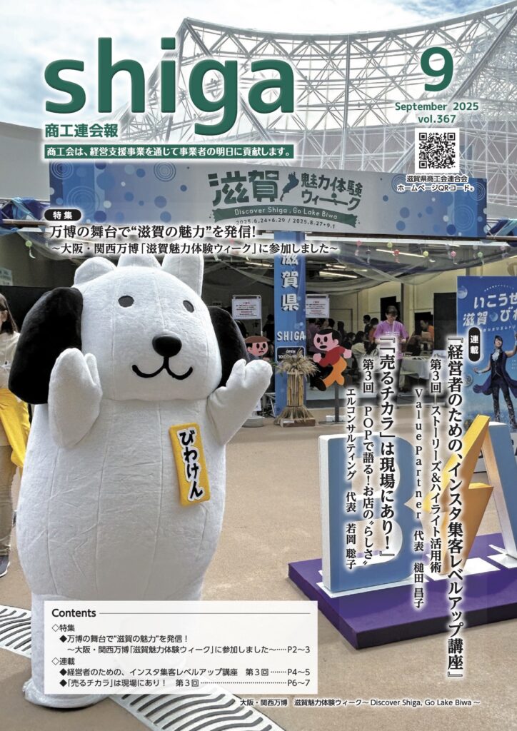◇特集 ◆万博の舞台で“滋賀の魅力”を発信! ~大阪・関西万博「滋賀魅力体験ウィーク」に参加しました~◇連載 ◆経営者のための、インスタ集客レベルアップ講座 第3回 ◆「売るチカラ」は現場にあり! 第3回
