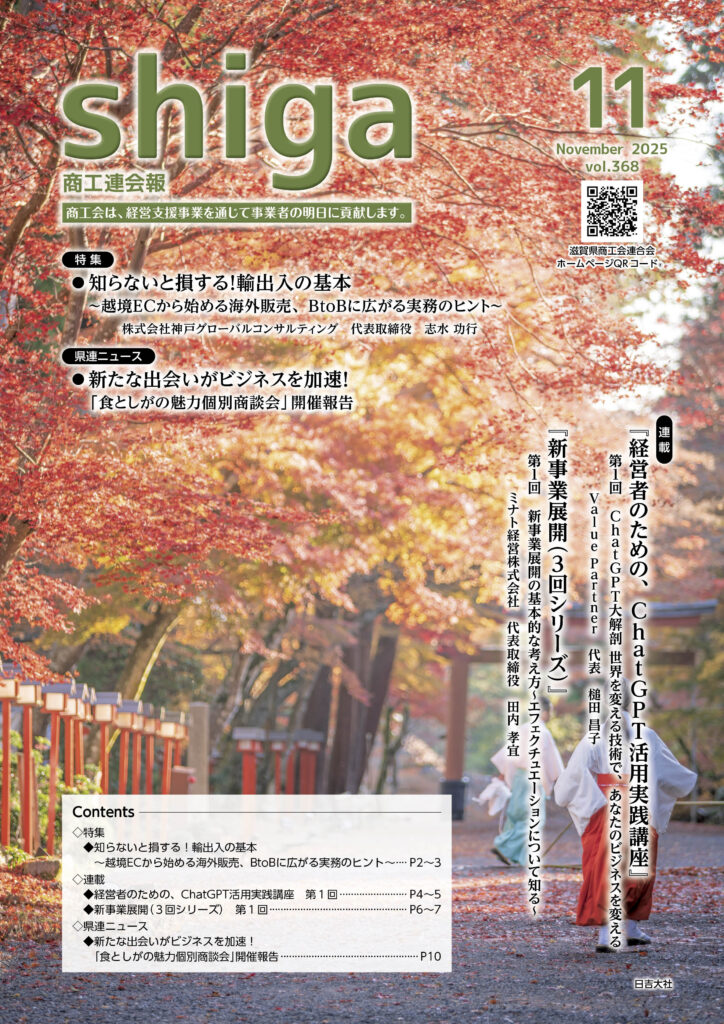 ◇特集 ◆知らないと損する!輸出入の基本 ~越境ECから始める海外販売、BtoBに広がる実務のヒント~◇連載 ◆経営者のための、ChatGPT活用実践講座 第1回 ◆新事業展開(3回シリーズ) 第1回◇県連ニュース ◆新たな出会いがビジネスを加速! 「食としがの魅力個別商談会」開催報告